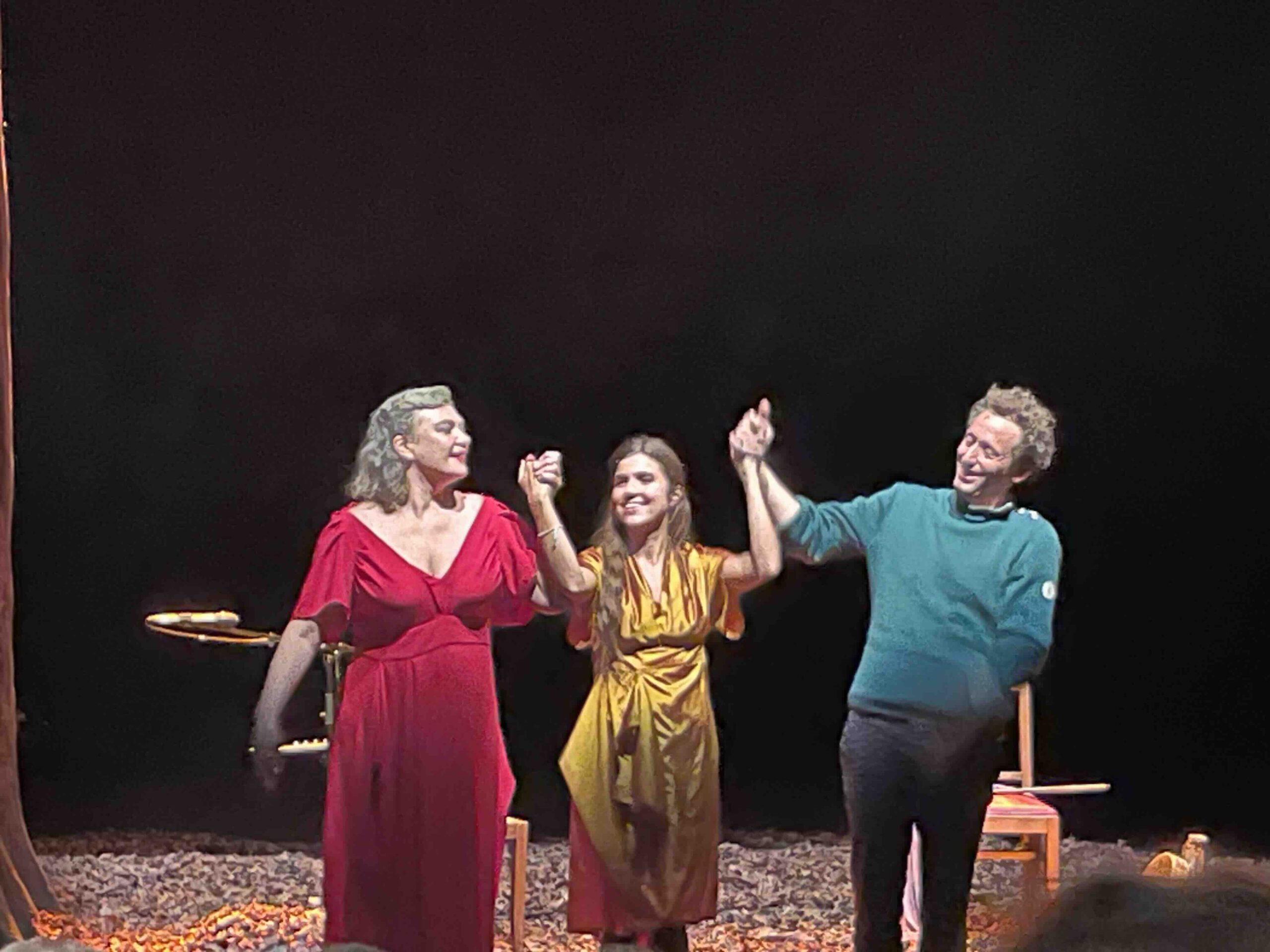Quand elles entraient sur la grande scène tout sombre du théâtre du Châtelet, sous l’immense arbre dont les branches se perdent dans le ciel et dont on ne voit que le fût géant, c’est vrai, on avait un peu peur. Elle pourraient avoir froid, dans leurs robes de princesses, sur leurs petites chaises. On ne sait pas très bien qui elles sont, des bergères tressant leurs paniers, des vestales, gardiennes de très antiques légendes. Autour d’elle, il y a beaucoup d’espace, le bruit de la pluie, des petits nuages, comme des dragons volants. Et puis, elles commençaient à chanter, et à parler, un peu. C’est ce qu’elles ont fait aussi au théâtre du Rond-Point le 1er octobre 2025. Leurs voix sont d’une profondeur et d’une légèreté irréelles, un peu étranges, portées par la seule complainte du violoncelle. C’est comme une boisson forte et suave en même temps. Au début, on est troublé, on se dit que s’est trop fort pour nous, et puis, on voudrait que cela ne s’arrête plus jamais. Elles ne sont que deux. Et puis, on comprend qu’il y a tellement de monde avec elles, une rue chauffée au soleil, un village, les femmes d’hier, de jadis, de toujours, les enfants qui chantent et ceux qui meurent, car les enfants qui meurent ne finissent jamais de vivre dans nos cœurs.