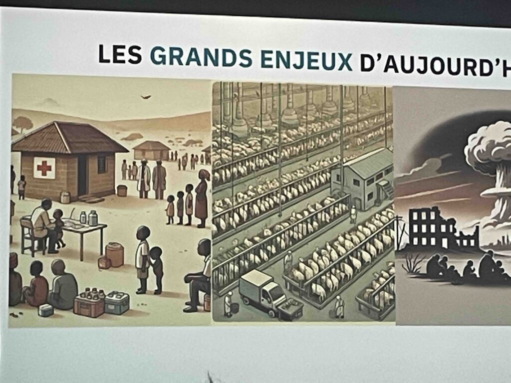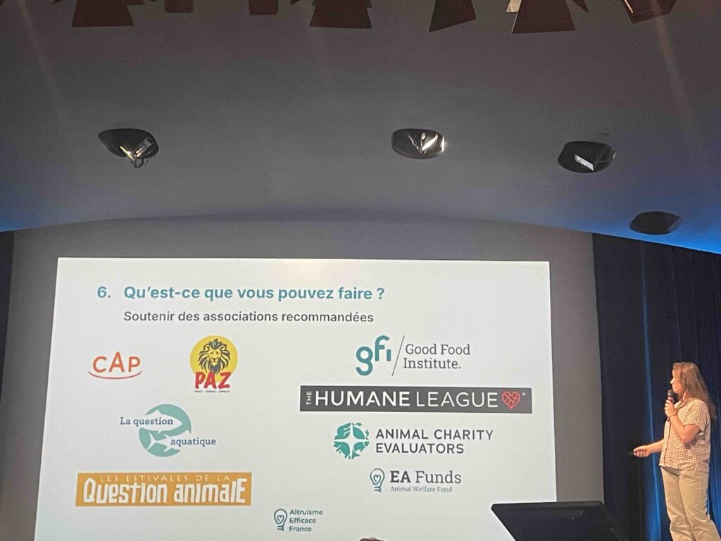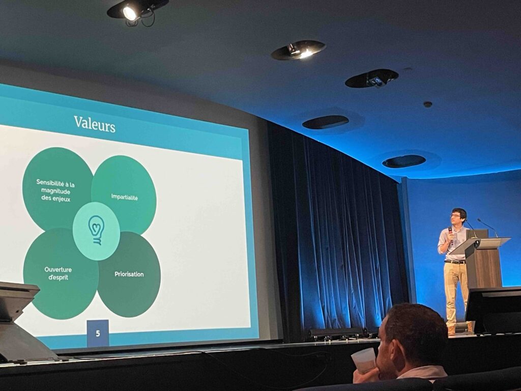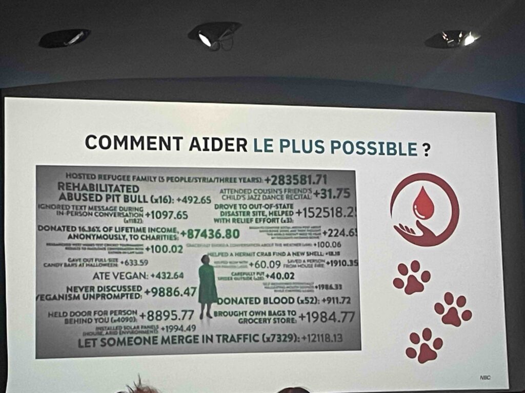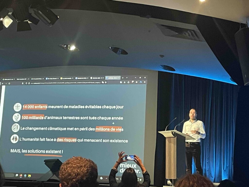 L’Humanité en péril. Fort(e) de ces conseils et rassasiée par un très bon déjeuner végétalien, l’assistance nombreuse s’est motivée pour une après-midi studieuse. Ainsi que le rappelaient les membres du directoire, « l’altruisme efficace, c’est passer de la réflexion à l’action concrète. » Les propositions et les matières à réfléchir abondaient aux réunions informelles qui se tenaient dans l’espace Zodiac pendant que les l’auditorium accueillait de nouveaux intervenants. Samuel Dupre, Juliette Finetti et Loic Watine expliquaient comment leurs associations, Happier Lives Institute , Lead Exposure Elimination Project et Innovation for Poverty Action. Ils étaient suivi par des éclairages la santé mentale, enjeu majeur de nos sociétés, mené par Juliette Michelet, psychologue, doctorante ENS-PSL) et par un focus très concret préparé Romain Barbe, fondateur avec Jennifer de l’association Mieux Donner . Dans les années 1960, on pensait qu’on allait enfin éradiquer la faim, les maladies, les guerres dans le monde. Comme nous nous sommes trompés. En quelques mots, Romain a corrigé le tableau : « 14.000 enfants meurent de maladies évitables chaque jour : 100 milliards d’animaux terrestres sont tués chaque année ; le changement climatique met en péril des millions de vie ; l’humanité fait face à des risques qui menacent son existence »… Bon, et on fait quoi ? Vraiment très utile cette association, créée en juin 2024, qui permet de sélectionner rigoureusement les associations de terrain qui aident le plus dans divers domaines : santé mondiale, développement, bien-être animal, changement climatique, afin d’optimiser les dons.