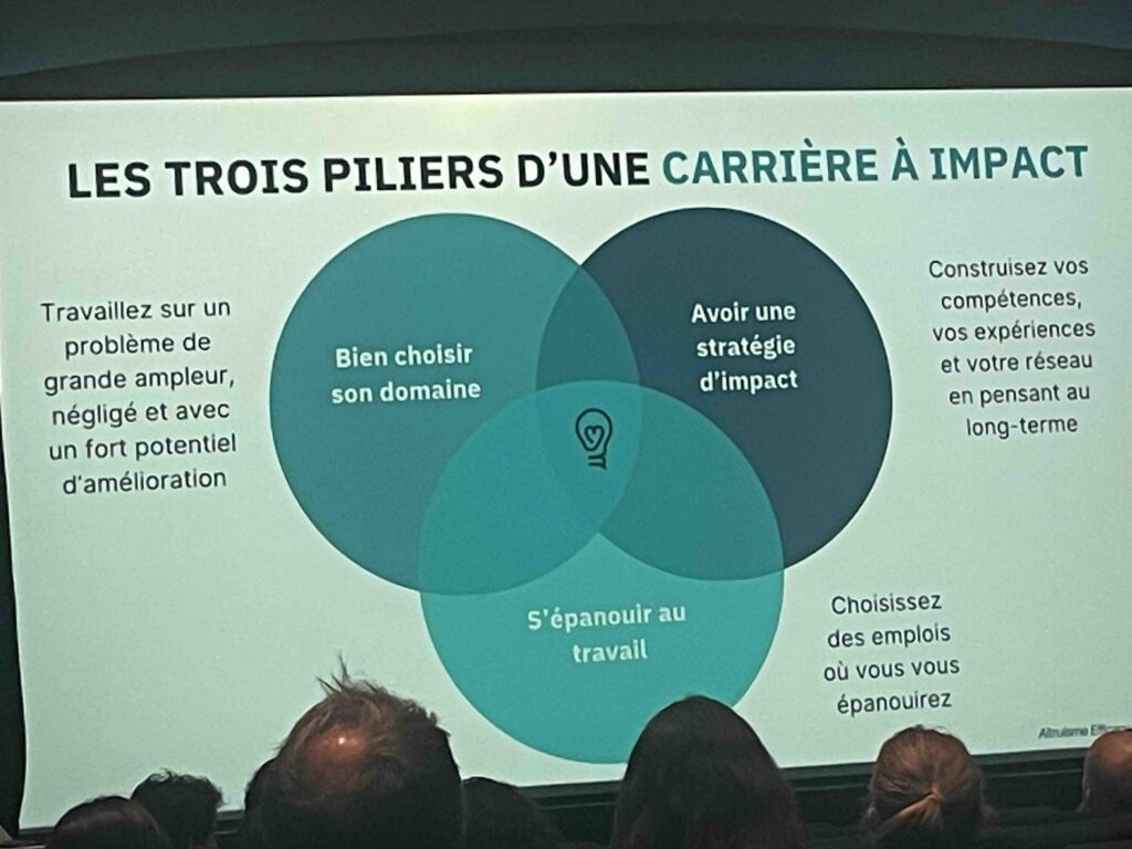Développer une carrière à fort impact. Avec bienveillance et esprit positif, Capucine nous a expliqué à travers l’exemple très concret de sa vie. Monteuse au cinéma pour les documentaires et longs métrages, elle a lâché cette passion le jour où elle a compris que voulait « essayer d’avoir le plus grand impact positif ». « Agir par sa carrière, c’est inégalé, on devient soi-même un acteur du changement et comme on passe 80.000 heures de notre vie à travailler, autant bien choisir son domaine pour s’épanouir dans son travail. Il n’y a pas de recette parfaite, mais AEF propose des formations et un guide carrière qui permet de construire ses compétences et de proposer un profil pertinent pour les carrières à fort impact. » Autre élément à prendre en compte, le choix de son domaine de compétence et l’utilité de « se consacrer à un problème de grand ampleur négligé et avec un fort potentiel d’amélioration », ce qu’en d’autres termes, on pourrait appeler une « niche » ou « the right man in the right place (la bonne personne au bon endroit). Car AEF place le travail et la bonne utilisation des compétences au cœur de son action. Travailler, toucher un salaire, voire ses compétences reconnues, se trouver en sécurité financière et disposer d’un bon réseau permettent ensuite de mieux agir par sa carrière ou par son engagement. On aurait dit jadis : « aide-toi, le ciel t’aidera » ou encore, comme le dit le sage Thich Nhat Hanh, « tu ne peux aimer les autres, si tu ne t’aimes toi-même. » Pour le dire, encore plus pratiquement, dans les avions, si l’air vient à manquer, il faut d’abord placer un masque sur son visage avant d’aider les autres à respirer…