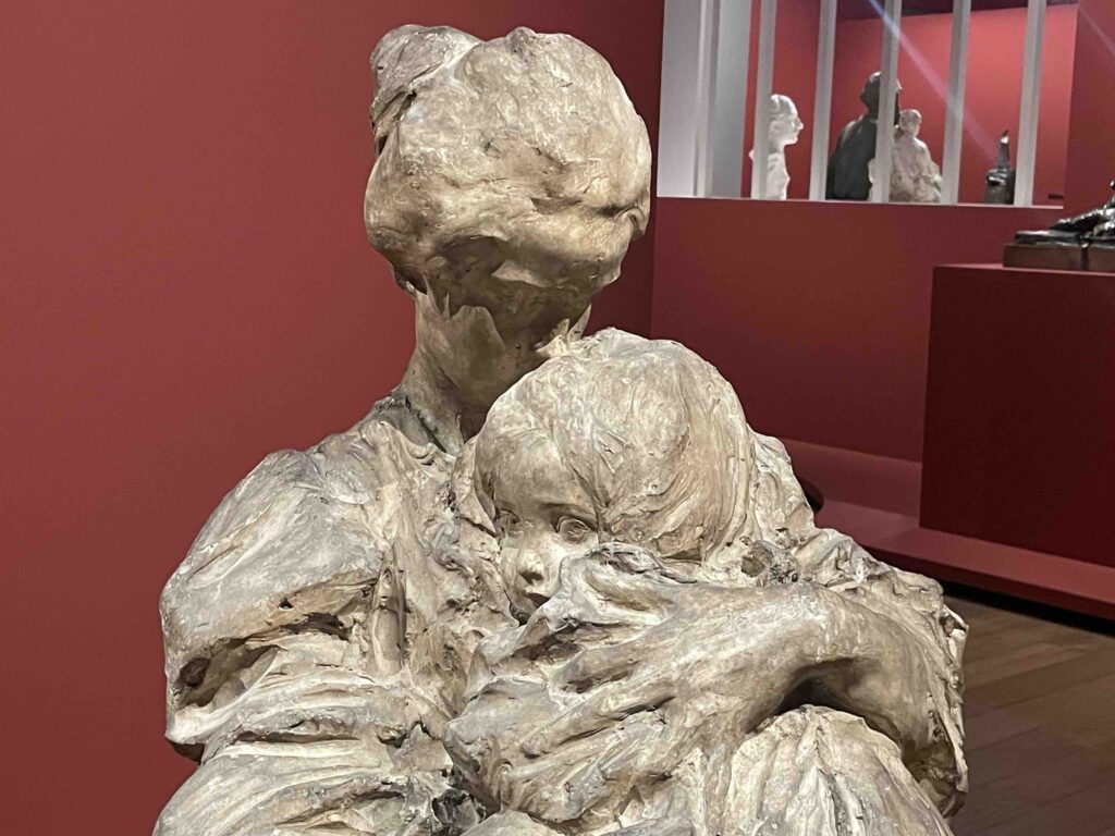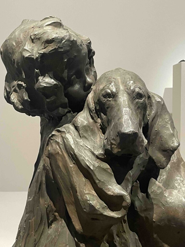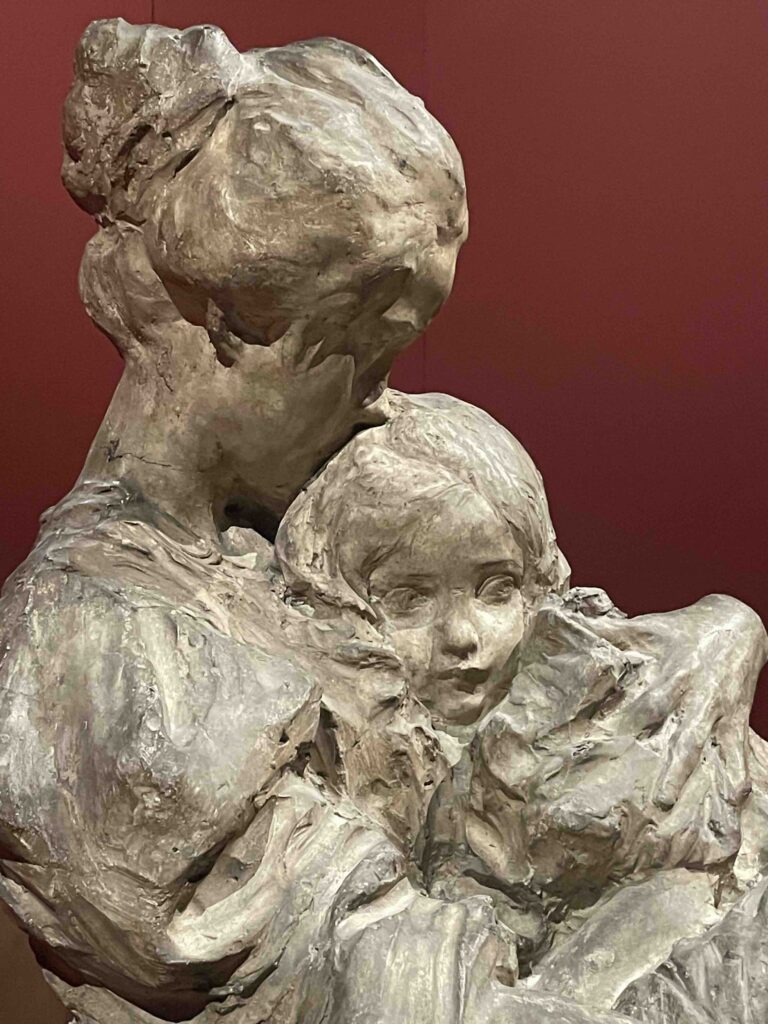 De même, cette maternité, réalisée à Milan en 1898, peu avant le départ de Troubetzkoy pour la Russie, Mère et enfant. Le sculpteur la présente à Paris lors de l’Exposition universelle de 1900. Très admirée, elle met en scène une jeune mère qui serre contre elle sa fillette, comme pour la consoler. La maternité et aussi le duo entre l’homme, ou la femme, et leurs compagnons animaux sont des traits marquants de son art.